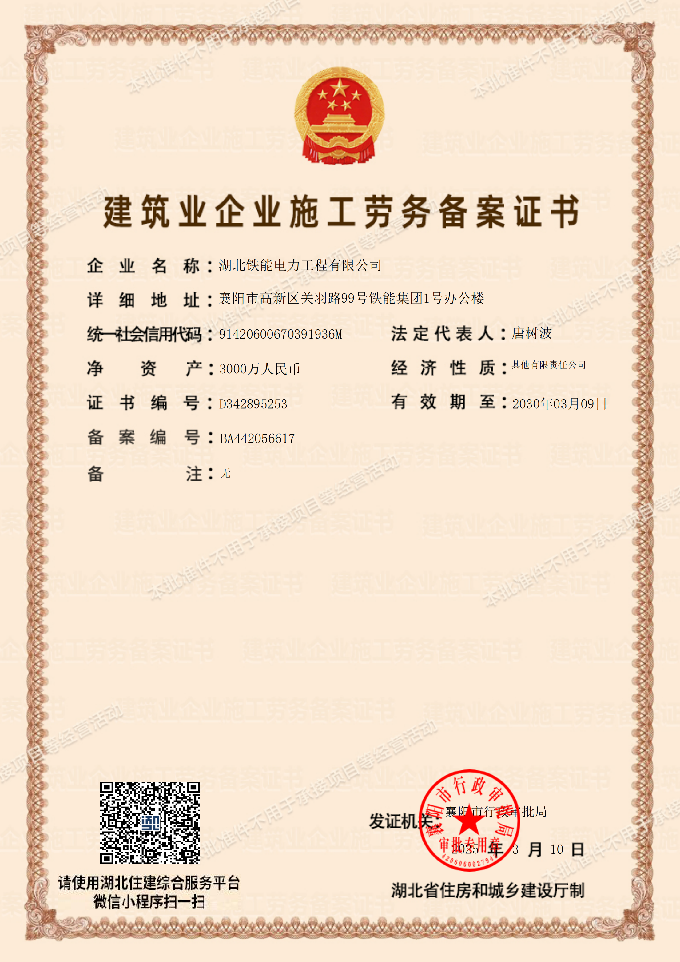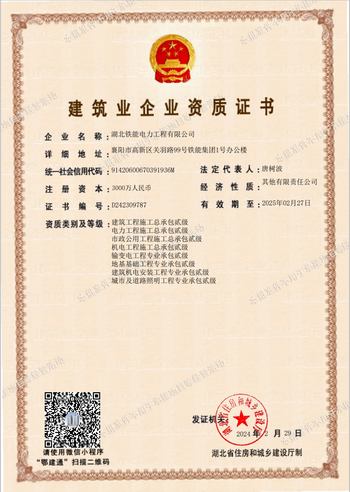 湖北鐵能電力工程有限公司成立于2008年,2019年6月遷入湖北鐵能電氣集團(tuán),公司注冊(cè)資金3000萬(wàn)元;可承擔(dān)單項(xiàng)合同額不超過(guò)企業(yè)注冊(cè)資本金5倍的110KV以下送電線(xiàn)路(含電纜工程)和同電壓等級(jí)變電站工程的施工;電力線(xiàn)路維修、檢修;送變電工程施工,房屋建筑工程施工,地基與基礎(chǔ)工程施工,土石方工程施工;電力工程咨詢(xún)服務(wù)。